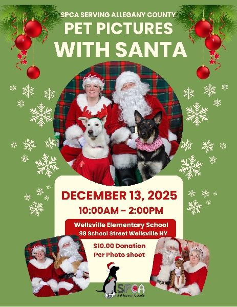 Pet Pics with SANTA is December 13th from 10am - 2pm on Saturday, December 13th at the Wellsville Elementary School. Santa welcomes not only dogs & cats...but ALL pets can come and get their picture taken with Santa for ONLY $10.00 AND we will be selling our 2026 SPCA Calendar for only $10.00