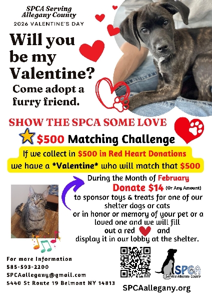 AND...If you are looking for LOVE and want to adopt a furry friend...just fill out an adoption application and submit it via email to SPCAallegany@gmail.com - Once approved we will schedule an appointment for you to come to the shelter and meet your new love of your life!! If you have an appointment scheduled in February and SING A LOVE SONG to us, we will take $25 off the adoption fee!